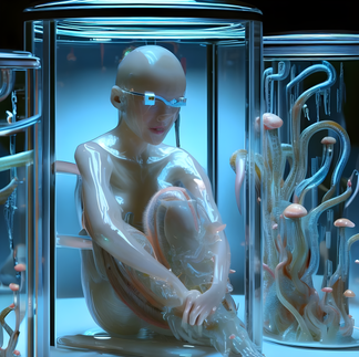 Eski siyah beyaz çıplak kadın fotoğraflarının dijital kopyalarını oluşturularak bunların yapay zekaya (StyleGAN) veri olarak verilmesi sonucu ortaya çıkan görsellerin başka diğer yapay zeka araçlarının (DALL.E, Disco Diff.) ve benim filtremden geçmesi sonucu oluşan varyasyonlardan oluşan “Beden Formasyonları I-II” işlerimle yer aldım bu sergide. Dışarıdan kadının ve bedenin dönüşümünü görürken, bedenin soyutlaşarak cinsiyetsizleştiği bir form görüyoruz, bir yandan da yapay zekanın onu nasıl gördüğünü ve birbirlerinin algıladıklarını nasıl yorumladıklarını da görüyoruz. Bu üretimlerimde aynı zamanda analog ve dijitalin kesişimine, dijital dönüşümün ve yapay zekanın algımızdaki etkilerine de dikkat çekmeye çalışıyorum.
